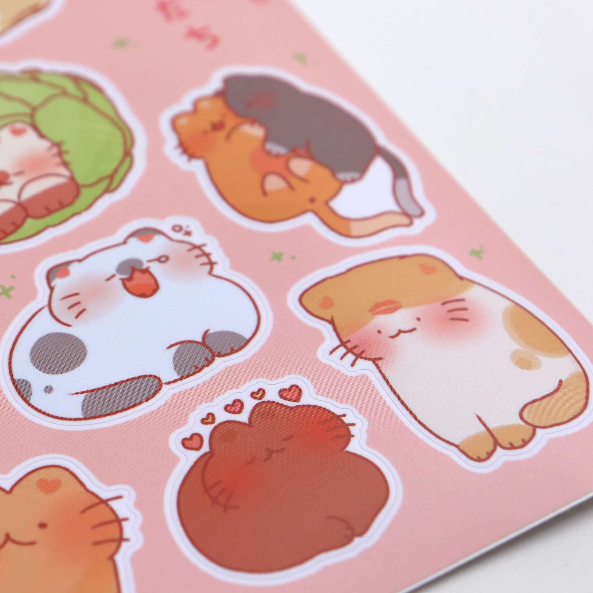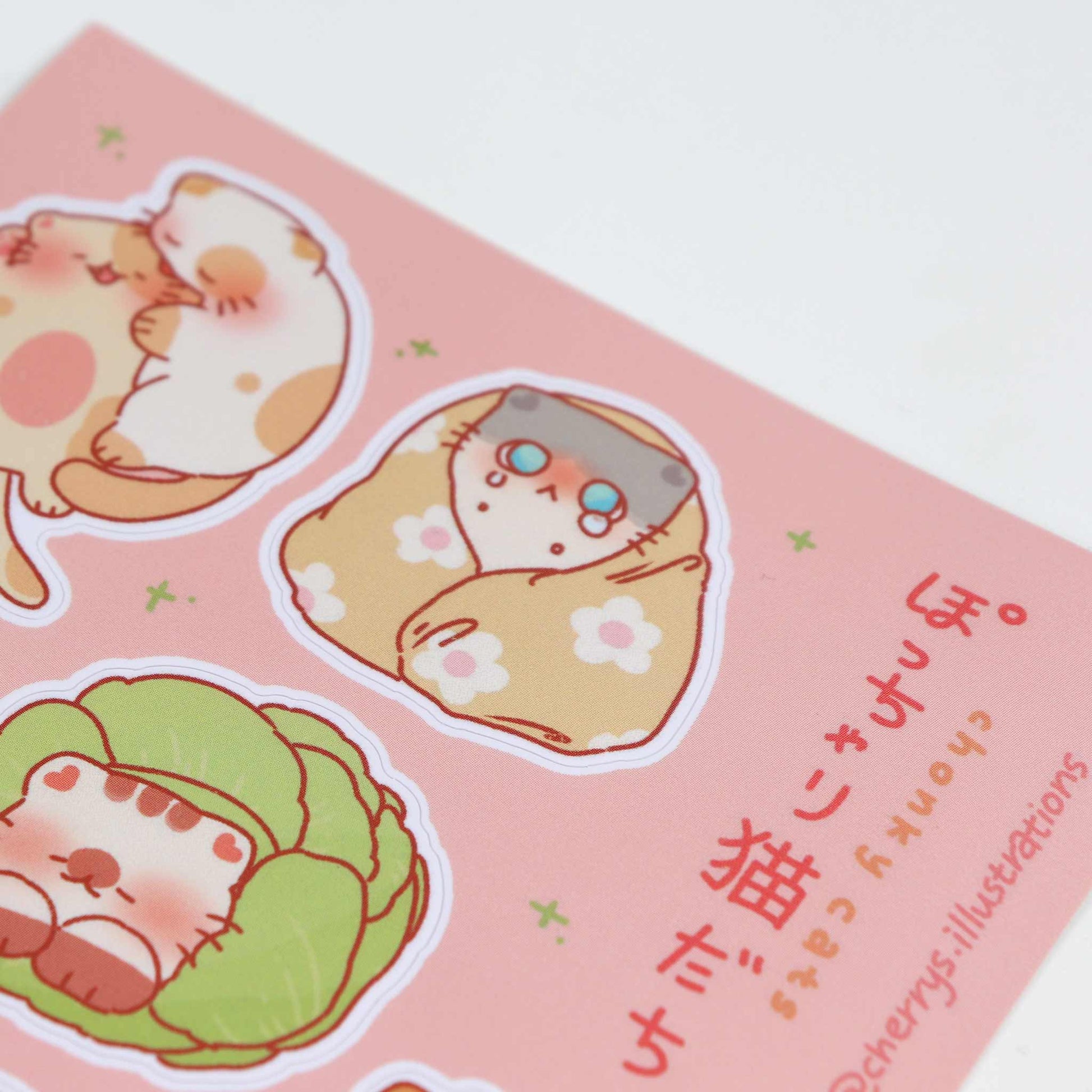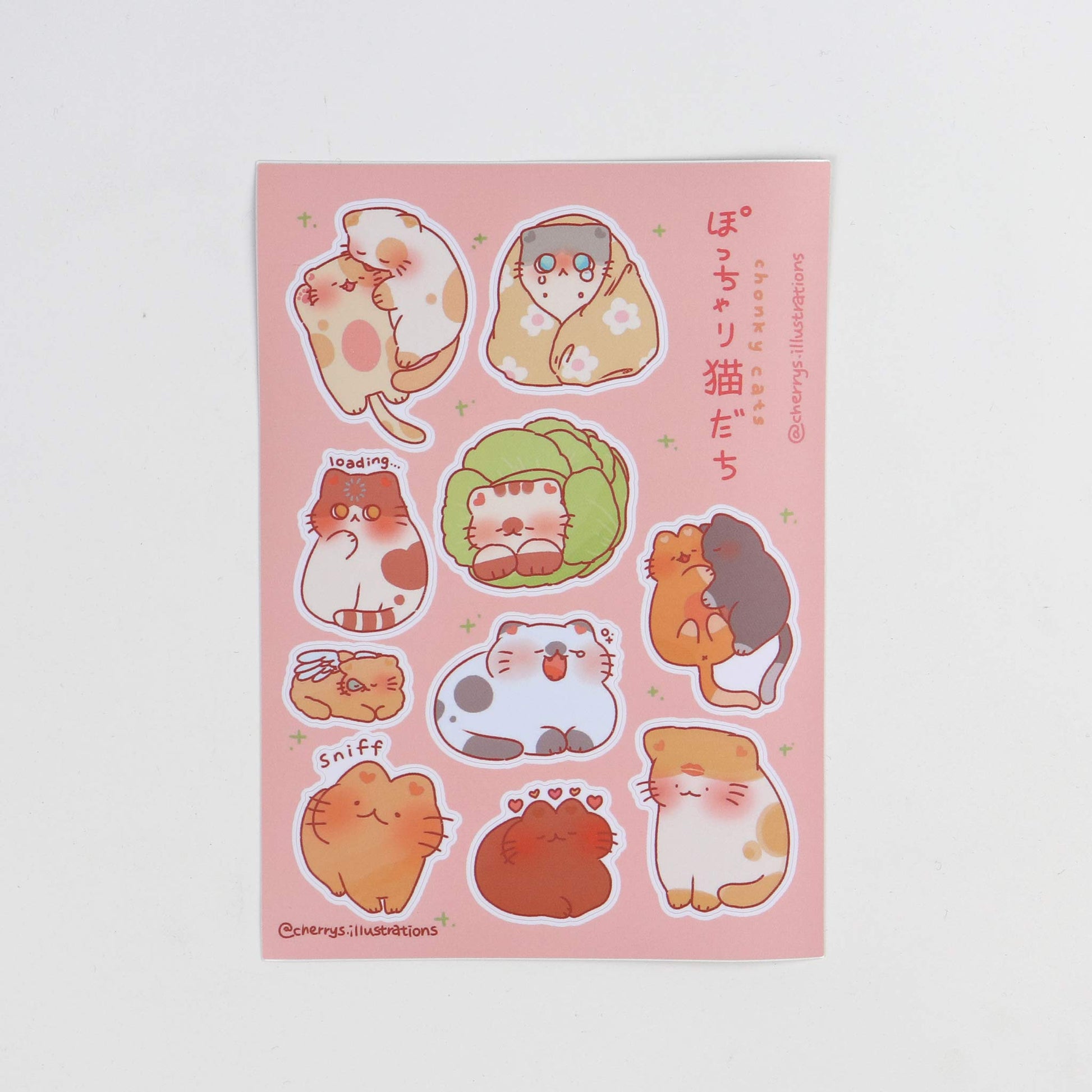 Chonky Cats V6 sticker sheet by Cherry’s Illustrations features a batch of round and expressive kitties, each showing off a bit of charisma and personality. From cozy blanket-wrapped loafs to adorable cuddle piles, these stickers perfectly capture the soft and silly nature of our little kitty friends.