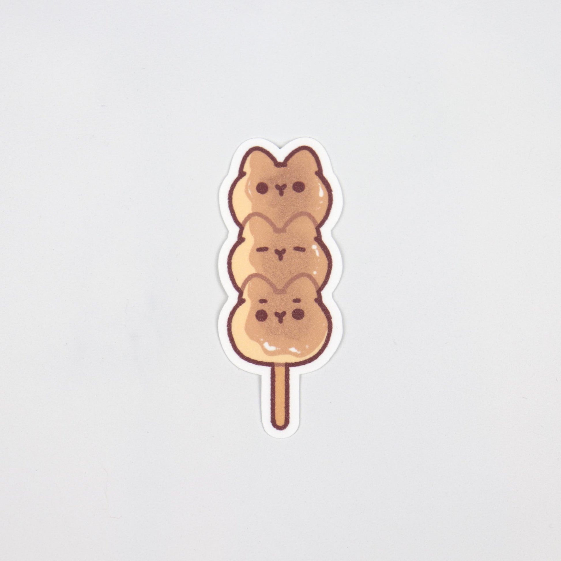 This waterproof sticker is an illustration of three cat-shaped dango on a skewer. Die-cut to roughly 3cm x 7cm, it's the perfect size for decorating water bottles, laptops, or any surface that would otherwise look kinda boring. Weather-resistant and built to last, this sticker won't fade or peel away. Ideal for anyone who loves cats and appreciates a bit of Japanese-inspired illustrations.