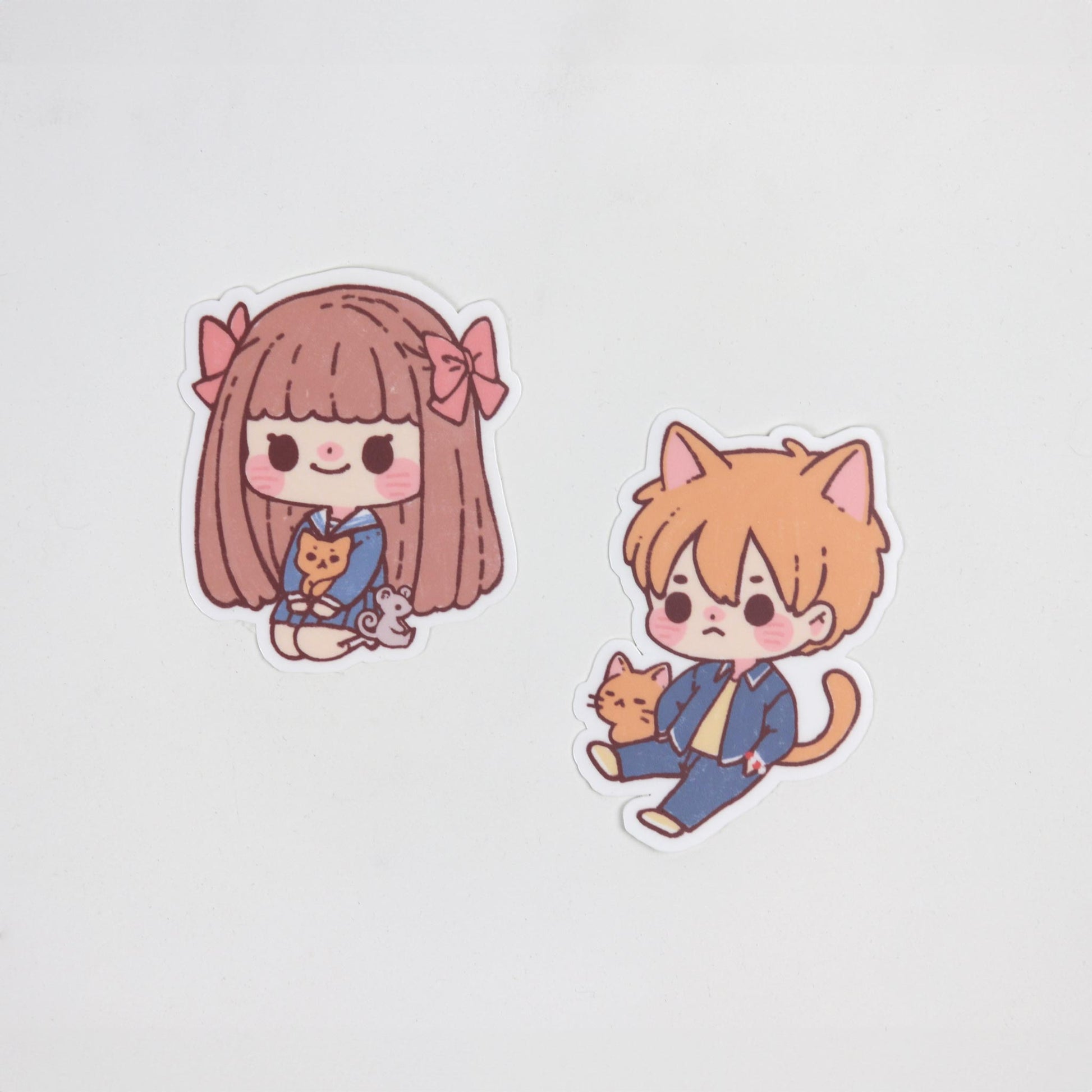 This sticker reimagines Kyo Sohma from Fruits Basket, grumpy and sitting with a little orange cat - just like in the series. With his signature scowl and bright orange hair this sticker captures Kyo’s fiery spirit in the cutest way possible.
