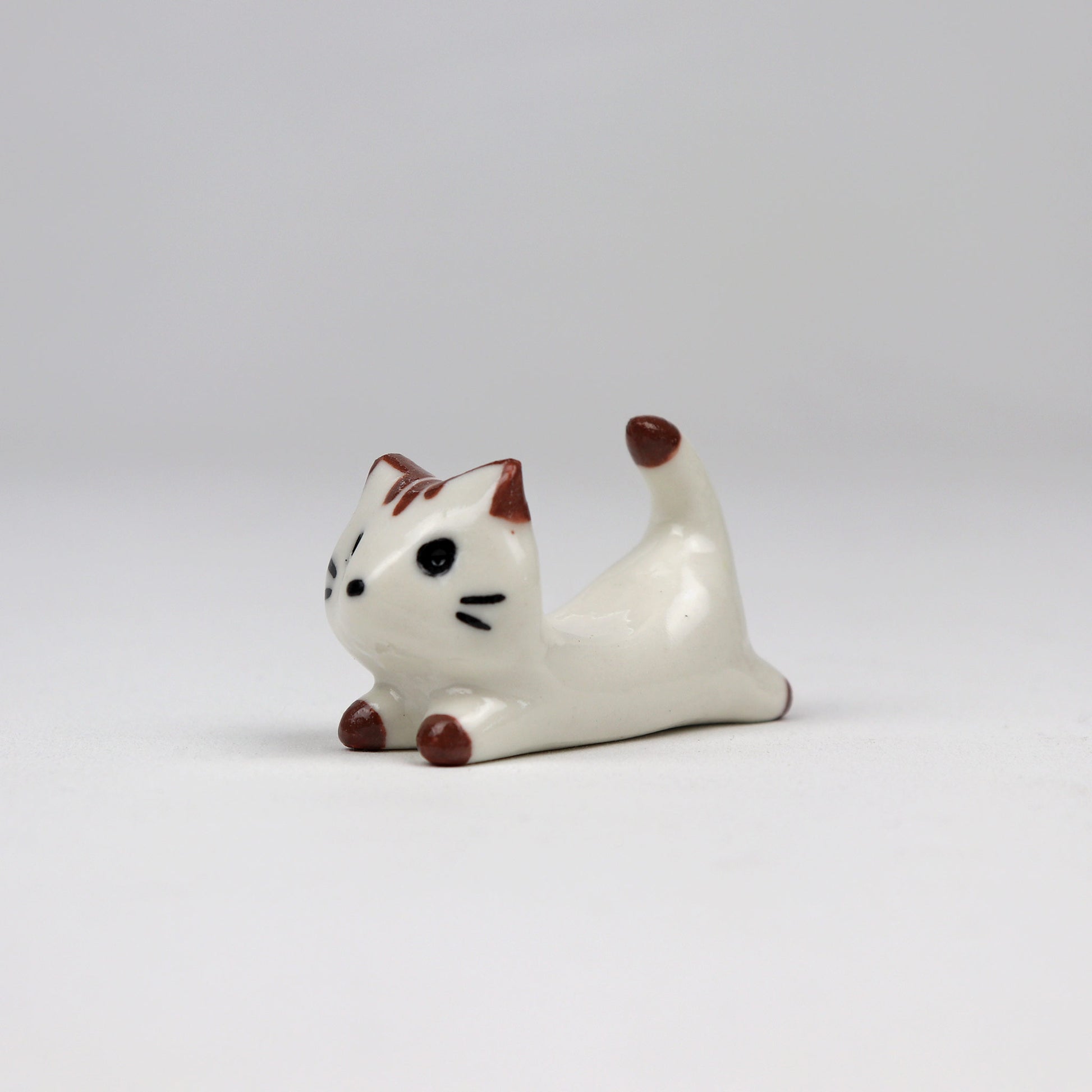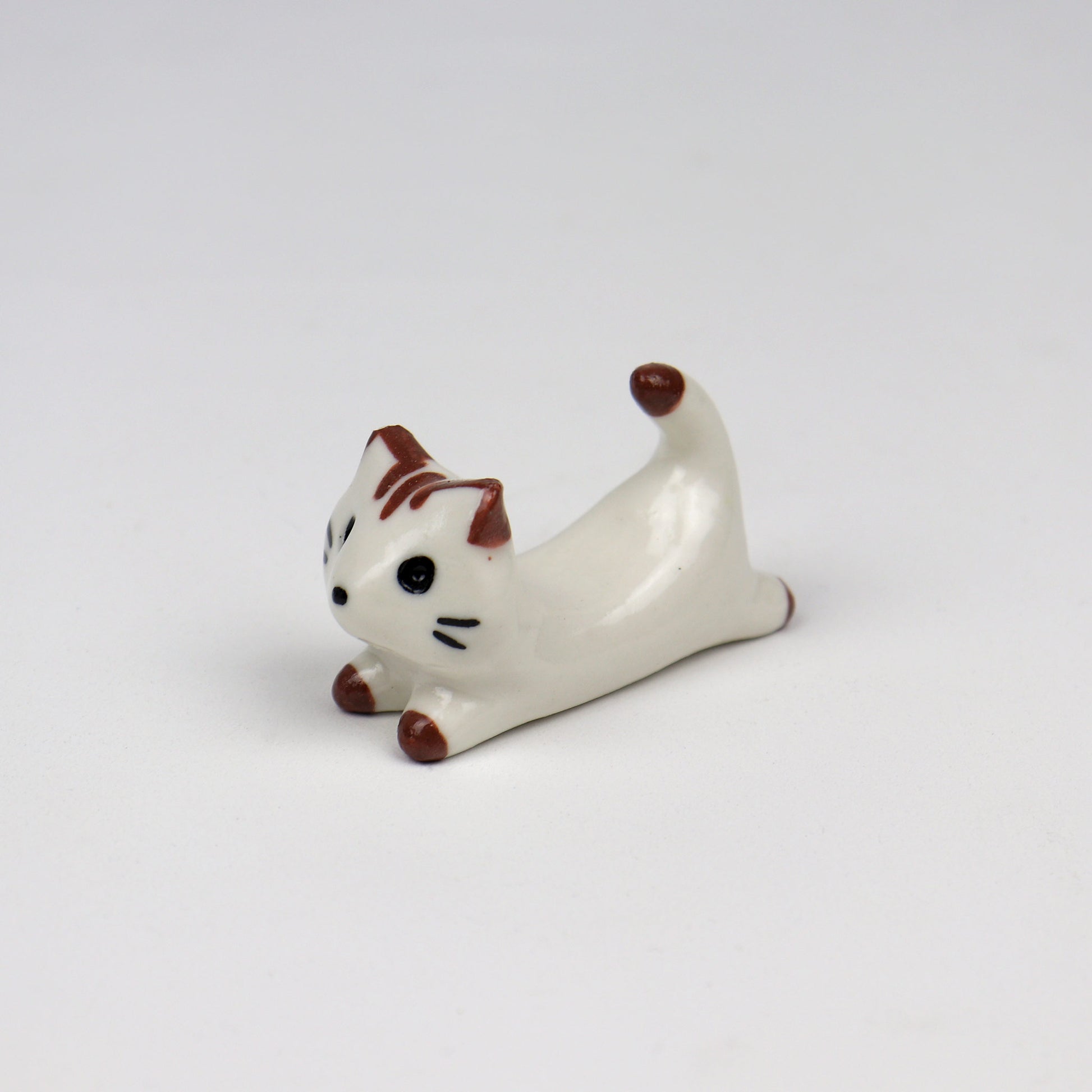 This handmade ceramic cat chopstick holder is both practical and adorable. Shaped like a little cat lying flat, it keeps your chopsticks off the table while adding a bit of character to your meal. Each piece is one of a kind, with hand-painted brown features on a smooth white ceramic body. Simple, sweet, and made with care—perfect for cat lovers who appreciate the little details.